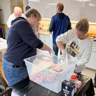 This last weekend, 17 participants gathered at the ELC church in Cokato to learn from Heidi and her helpers, husband Bruce and brother Cory, how to make potato sausage. It was a group effort, which is a great way to make it. Heidi provided the ingredients - ground pork, ground beef, potatoes, onion, salt and pepper, and beef casings. Participants and helpers provided the labor - slicing and grinding onions and potatoes, mixing all the ingredients in a large bin, and running the mixture through the stuffer to make large sausage links for everyone to take home with them. It was a social affair. People took turns at the jobs and observing and chatting on the side. Cleanup also went smoothly with all the help - many hands make light work. The event was a big success. Thanks again to Heidi, Bruce, and Cory for teaching this class for us, and for all the participants who came out to help, learn, and enjoy it! And, the potato sausage was, of course, delicious! You can find the recipe and pictures below.